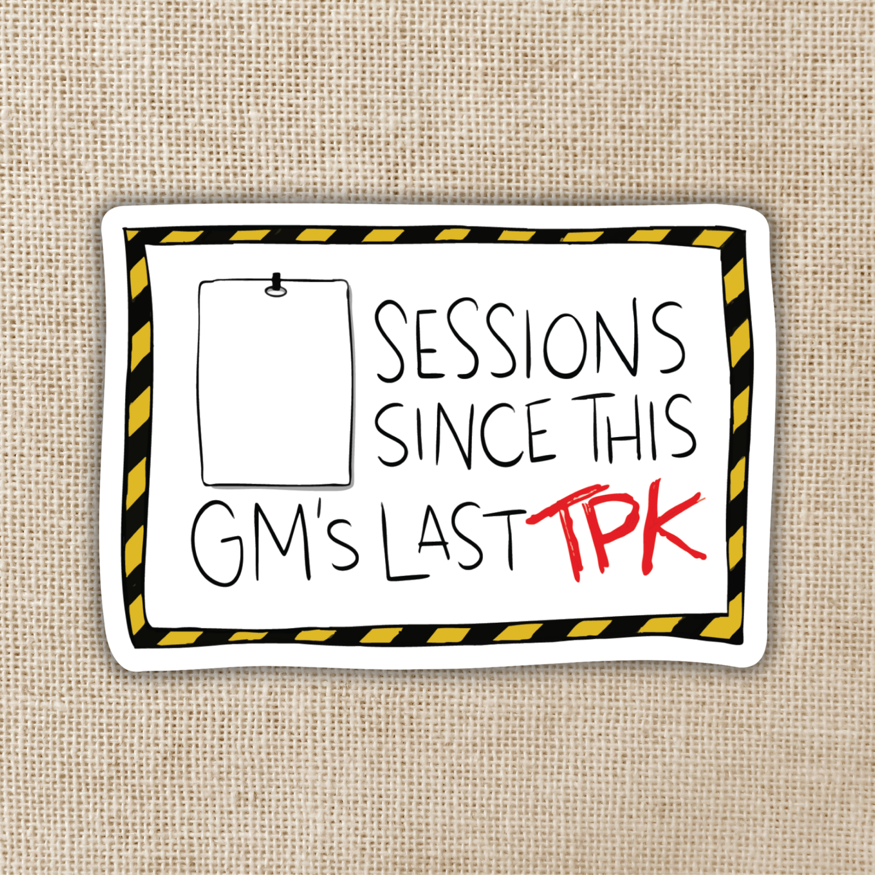 How many sessions has it been since this GM’s last TPK? Hopefully your characters live to see another day… the perfect sticker for all those particularly harsh game masters out there.